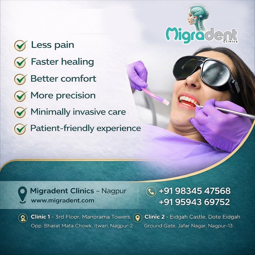 Modern dentistry ab sirf treatment tak limited nahi hai β ab focus hai precision, comfort aur patient-friendly care par. Laser dentistry ki help se dental procedures aur bhi gentle aur controlled ho sakte hain. At Migradent Clinics Nagpur, many patients choose advanced dental technology because they want a modern, comfortable dental experience they can trust. A calm environment, careful approach, aur updated technology β isi wajah se log advanced laser dentistry in Nagpur search karte waqt Migradent Clinics ko consider karte hain. π Migradent Clinics β Nagpur π www.migradent.com π² +91 98345 47568, +91 95943 69752