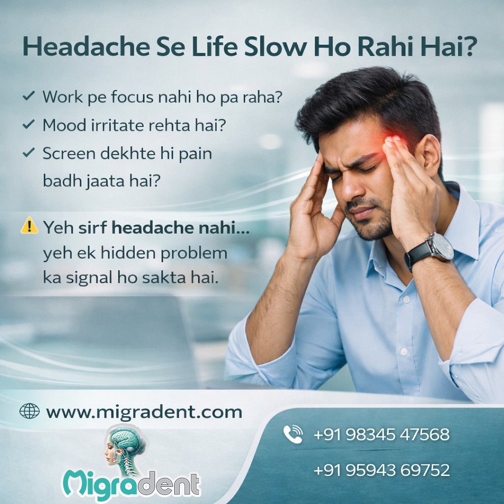 Jab headache roz ka part ban jaata hai, to focus, mood aur daily life sab affect hone lagta hai. Kai cases mein iska connection jaw joint (TMJ), teeth grinding, muscle tension ya bite imbalance se bhi ho sakta hai. Sirf pain ko manage karna enough nahi β reason samajhna zaroori hai. At Migradent Clinics Nagpur, patients visit to understand their frequent headaches aur migraine better. Kabhi-kabhi sahi understanding hi change ki first step hoti hai. π Migradent Clinics β Nagpur π www.migradent.com π² +91 98345 47568, +91 95943 69752