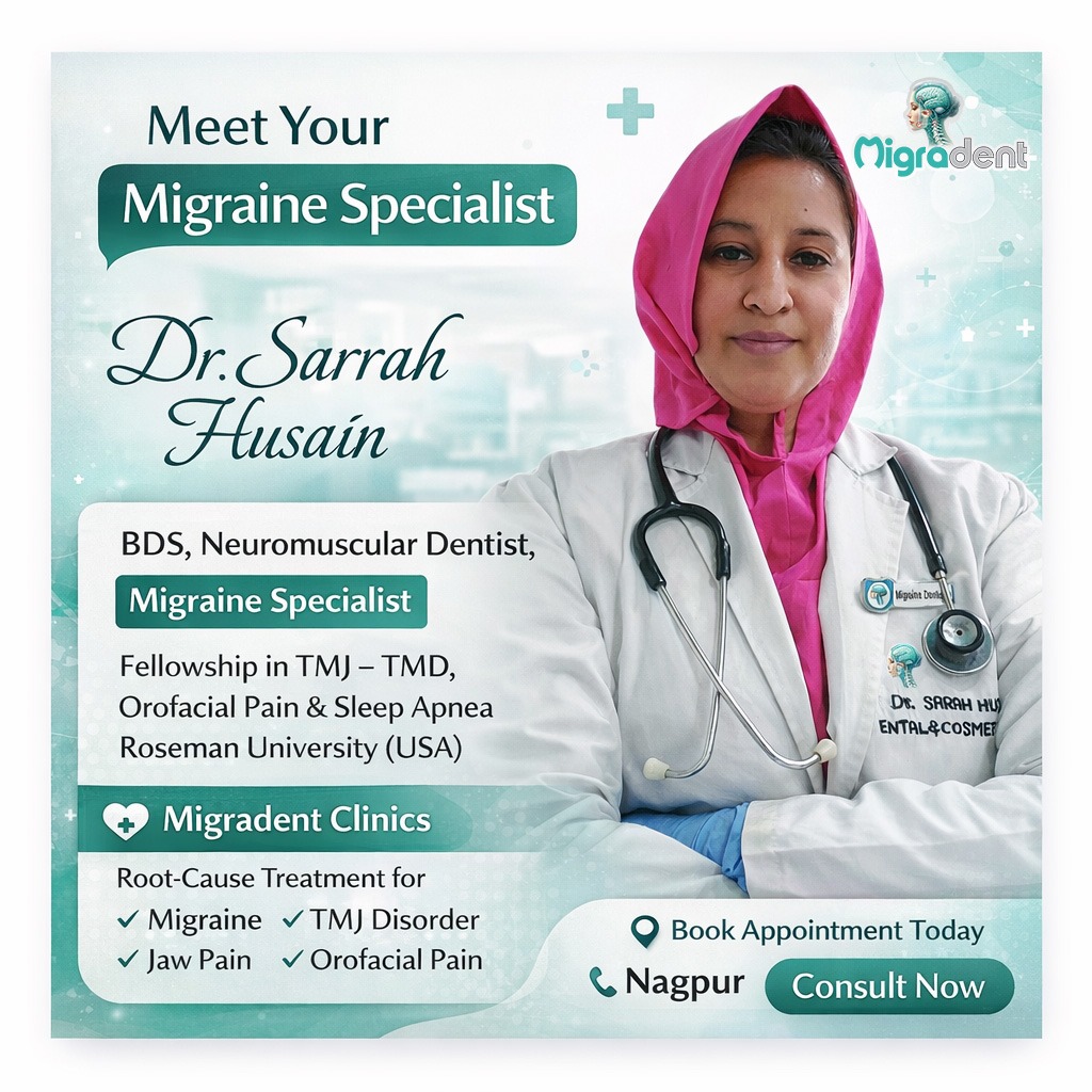 Kabhi-kabhi migraine ka connection jaw joint (TMJ), teeth grinding, bite imbalance aur facial muscles se bhi ho sakta hai. Isi connection ko samajhne aur evaluate karne ke liye kuch dentists specially migraine aur TMJ related conditions par focus karte hain — jise log Migraine Dentist kehte hain. At Migradent Clinics Nagpur, many patients visit when they are searching for guidance about the connection between migraine, jaw joint and teeth. A careful consultation aur patient-focused approach Migradent Clinics ko patients ke liye ek trusted place banata hai. 📍 Migradent Clinics – Nagpur 🌐 migradent.com 📲 +91 98345 47568, +91 95943 69752