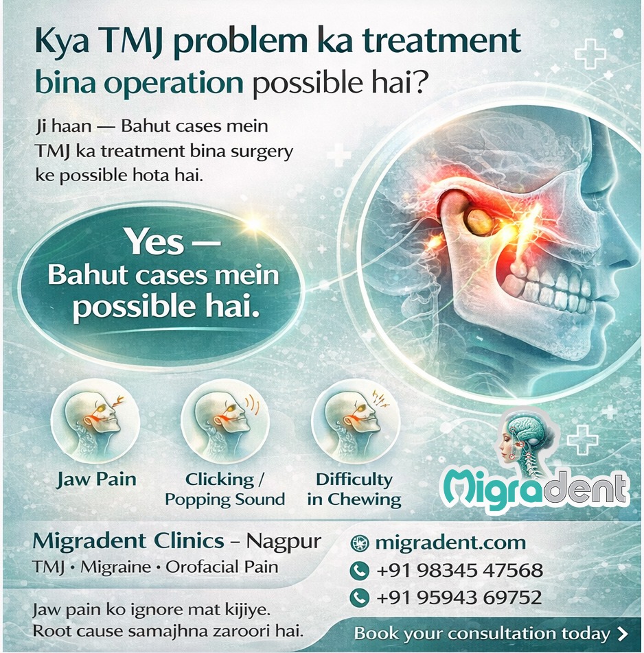 Jaw pain, clicking sound, ya mouth open karte waqt discomfort ho to kai log sochte hain ki surgery hi solution hoga. Lekin har TMJ case mein operation zaroori nahi hota. Many patients visit Migradent Clinics Nagpur to understand their TMJ (jaw joint) problem better and explore possible non-surgical options. The first step is always a careful evaluation and understanding of the jaw joint, teeth, and muscle connection. π Migradent Clinics β Nagpur π www.migradent.com π² +91 98345 47568, +91 95943 69752